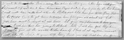 I positively must write to you it has been two weeks since I received your dear good letter this is the longest I have neglected you since you have been gone this is almost the only time I have had since I received your letter for writing we have had company & Aunt Sue(5) has been quite sick since you wrote but is better now she was real sick last Monday had the Doctor to see her but she is able to be up now most of the time she was looking ever so much better until she had this last spell it makes her look rite pale. Well we were real glad to hear you had quit work in the mines. I don't like under ground work, We have had another festival not a Cumberland(6) festival but a “ North Methodist” festival you should have been here as you are so partial to them, it was a raspberry instead of a strawberry festival but it was real nice. You think the weather is warm, warmer yea hot out there do you think it is somewhatly that away here once in a while. I had a letter from Mary Ann the other day, she went over to Pleasant Hill on the fourth, she and Mannie (Munrie?) Jordon & he killed his horse, drove it until it just died. I am not a bit sorry for him he should have known better than that. Mary Ann wanted to know what you wrote. She did not say anything about the music I do not expect she had received it when she wrote. Well I have news to tell you Uncle Mike(7) is going to start to Ireland in the morning to get his children, we all hate to see him go ever so much but he will go in spite of all we can say or do. I never expect to see him again but he thinks he will be back in about two months but I fear it will be a long two months before he returns. Uncle was at home today he only gets to come home Sundays a little while, I am anxious for his time to get out. Mr & Mrs Cooper is here now they came over to spend the afternoon with us they are both well. Bery you should be at home now we have plenty of chickens and the best garden we have had in a long time. We have the most nice things to eat intirely out of the garden. Oh yes our oleander is in bloom and is so pretty, my Chinese lillies are not going to bloom in this country. I do not believe they will bloom in this country, they are some of the blades turning yellow & it looks like they were going to die. I do wish so much that they would bloom. Granma(8) says to tell you that she shall never forget you in her prayers that you may someday return to your home & sends lots of love to you. Your Ma(9) is here says tell you she wants to see you so much, says you must take good care of yourself. Billie(10) wrote to you last week but directed his letter to Alta City(11) I hope you will get it he is so anxious to get a letter from you. Aunt Sue sends lots of love to you and says she wants to see you very much & will never forget to pray for you that god will protect her absent boy & Keep him from all harm and shield him from temptation while he is far away from home & kind friends. Eli received your letter the other day will write to you soon. Oh yes I like to forget to tell you that we are all going up to Laurence(12) to a picnic, we thought we would like to take a ride for fun & go with us. [last part of letter missing]